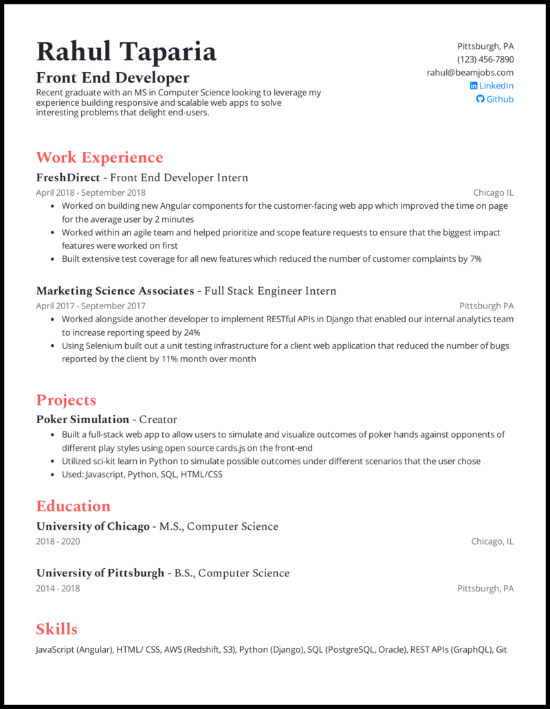 Sample front end developer resume—see more templates and create your resume here. If there is one thing you takeaway from this post then let it be this: Sample cover letters for a writing position. It can be project work, internships or prior job experience. Download sample resume templates in pdf, word formats.